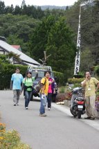 皆が揃ってお腹も一杯になったところで、市内観光に出かけました。まず、遠野ふるさと村。支配人の鈴木裕子さんが出迎えて下さいました。村内では、明日(22日)のライブの宣伝も兼ねて、手話歌を1曲ご披露。