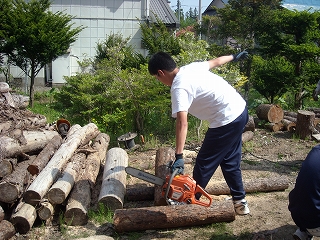 やかまし村には男子が8名ほど振り分けられてきました。お昼過ぎから薪割りを手伝って貰いましたが、今回はチェーンソーで丸太を切ることろから・・・。チェーンソーを上手に使っていましたが、この快感を覚えてジェイソンにならないでくださいね。