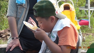 生憎の雨模様で、少し肌寒いほどの天気でしたが、学校指定のジャージに半ズボン姿の少年達は、元気に薪割り、焼きそば調理、ピザ調理体験、鮒釣りを楽しんでいました。