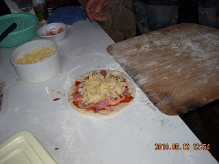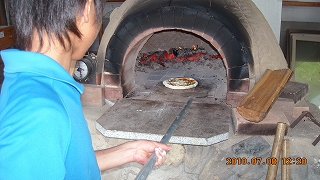 ピザの生地を延ばし、トッピングして焼きましたが、今日は窯の温度が今一上がらず、焼き上がるのにやけに時間がかかってしまいました。いつもなら、窯に入れてから1分少々でやけるのですが・・・・。