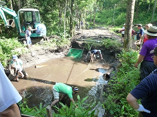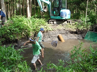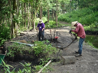 7月17日13:30にやかまし窯の前で開講式を行い、14:00から池に移動して、「茶室にもなる小屋」の外装用の竹を割る作業、紫陽花iの移植、池の清掃をしました。作業風景は遠野山里ネット(NPO)から写真提供を受け次第掲載します。