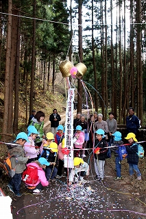 2008年から少しずつ作り始めた「やかまし村遊歩道」が途中まで完成したので、今日は、地元保育園の園児14名と高齢者の「ふれあいの会」の皆さんを招いて開通式を行いました。天気が良く、少し汗ばむほどの陽気でした。