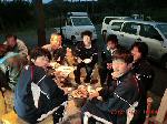 夕ご飯は、雨模様を気にしながら戸外でジンギスカン。(中学生18名と集落の人達8名、合計26名の大ジンギスカンパーティー)。